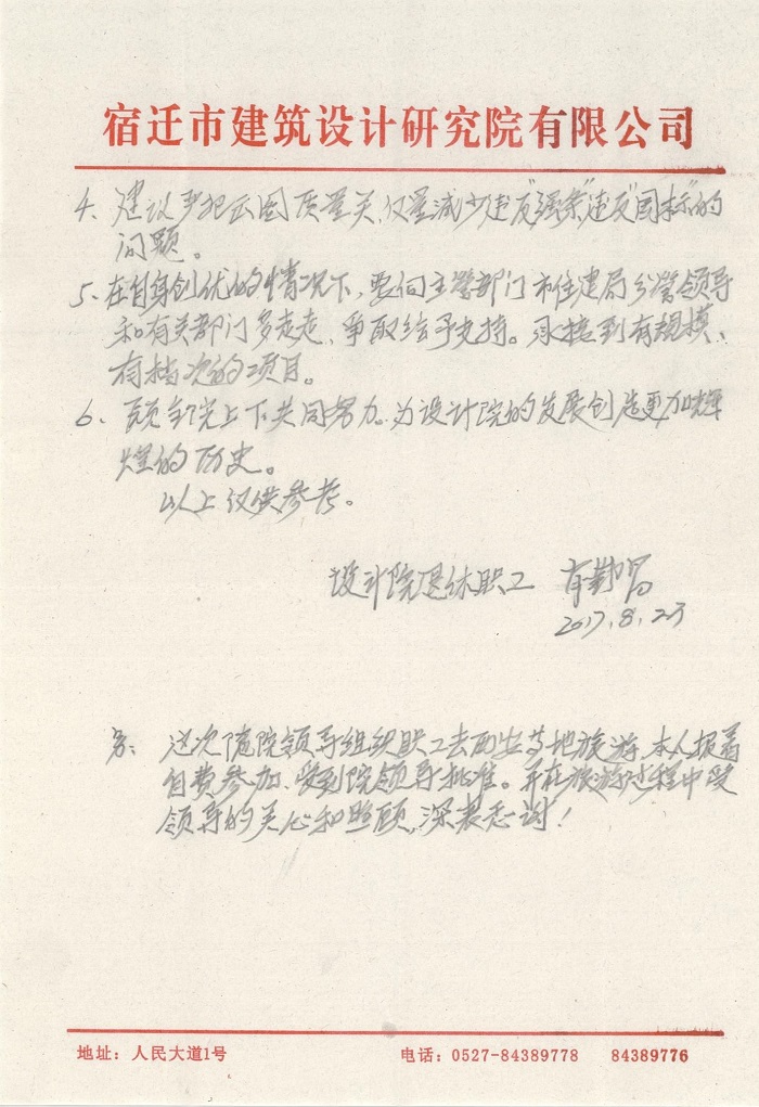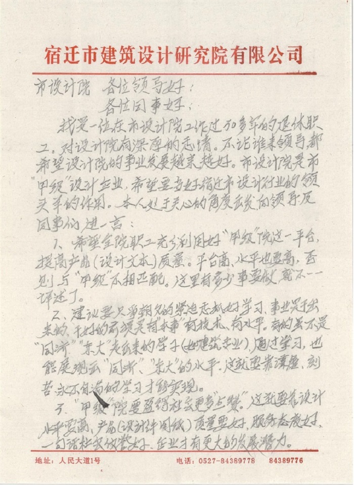 我是一位在市設(shè)計(jì)院工作過30多年的退休職工,對(duì)設(shè)計(jì)院有著深厚的感情。不論誰來領(lǐng)導(dǎo),都希望設(shè)計(jì)院的事業(yè)發(fā)展越來越好。市設(shè)計(jì)院是是甲級(jí)設(shè)計(jì)企業(yè),希望要當(dāng)好宿遷市設(shè)計(jì)行業(yè)的領(lǐng)頭羊的作用。本人處于關(guān)心的角度出發(fā),向領(lǐng)導(dǎo)及同事們進(jìn)一言: